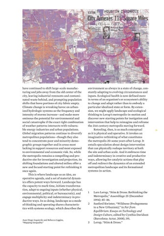 have continued to shift large-scale manufacturing and jobs away from the old center of the city, leaving industrial remnants and contaminated waste behind, and prompting population shifts that leave portions of city fabric empty. Climate change is wreaking havoc on urbanized hydrologic systems as the frequency and intensity of storms increase—and make more ominous the potential for environmental and social catastrophe if the exact right combination of weather patterns intersects with vulnerable energy industries and urban populations. Global migration patterns continue to diversify metropolitan populations—though they also tend to concentrate poor and minority demographic groups together and in areas most lacking in support resources and most exposed to environmental and economic risk. So, while the metropolis remains a compelling and productive site for investigation and projection, its shifting foundations and altered milieu offer a new and fecund starting point for rethinking it once again. This is where landscape as an idea, an operative agenda, and a set of material dynamics offers potent ways forward. Landscape has the capacity to mark time, initiate transformation, adapt to ongoing inputs (whether physical, environmental, political, or bureaucratic), and engage multiplicity and indeterminacy in productive ways. In so doing, landscape as a mode of thinking and operating shares characteristics with systems ecology, which describes the