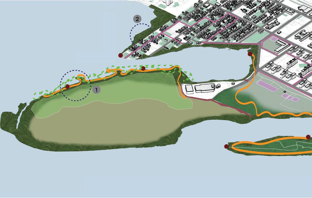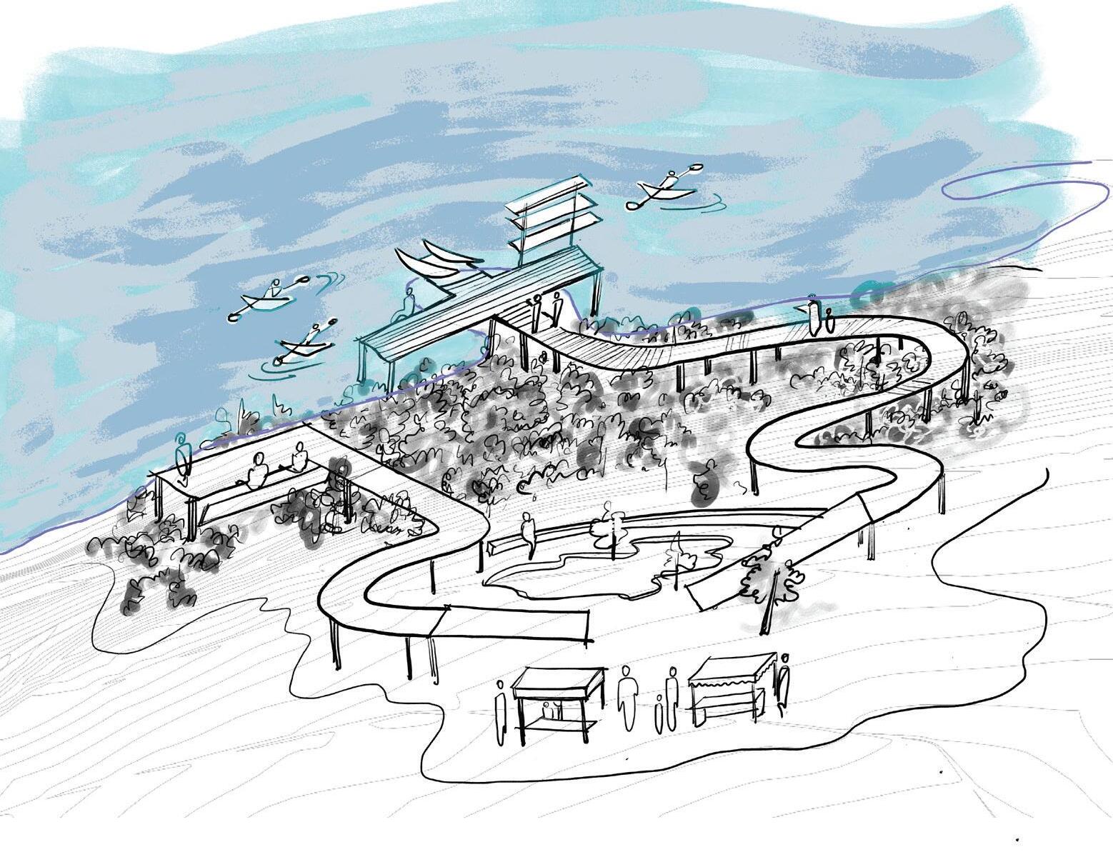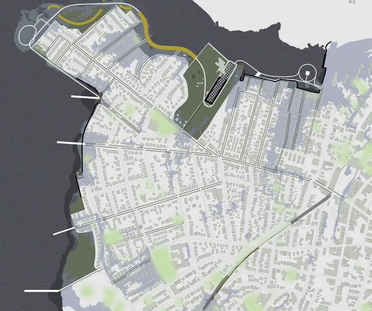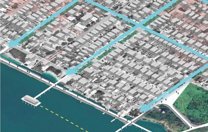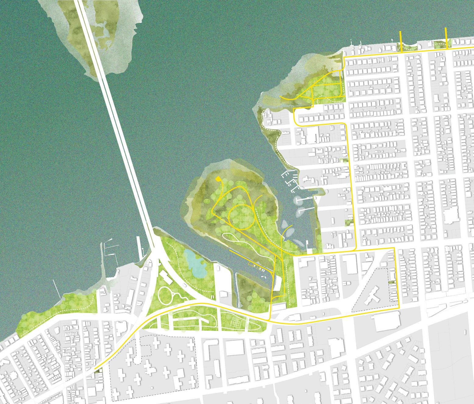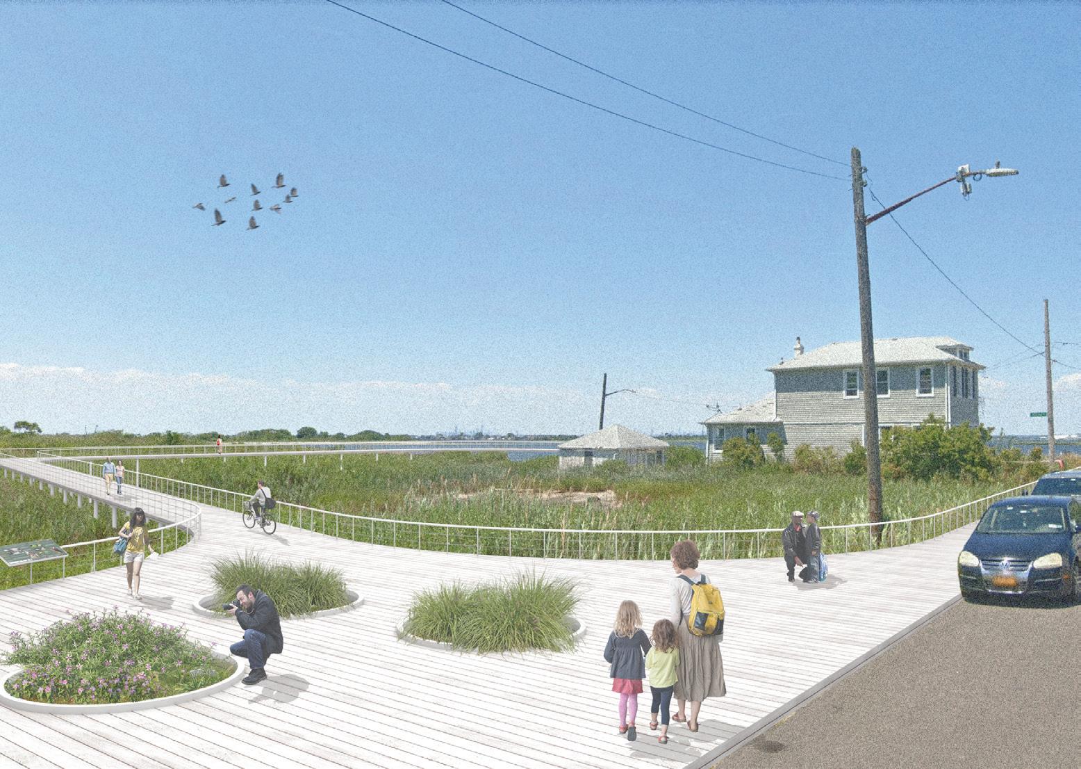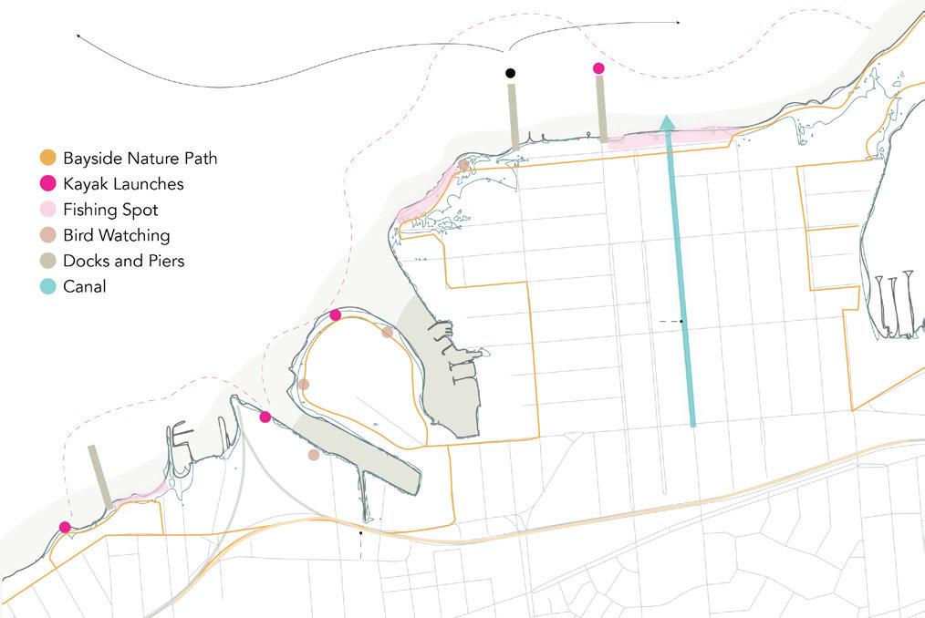 A system of raised pathways and boardwalks will connect existing green-spaces along the bay. Connection points will be placed at the end of each dead-end street to ensure that this new public space is accessible to everyone.