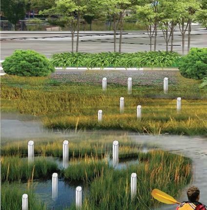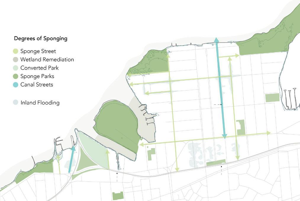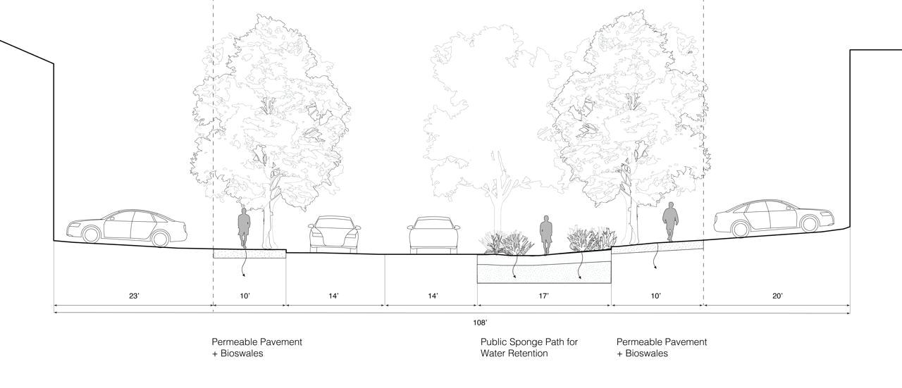 Built into these pathways will be a series of natural and manmade flood infrastructures to reduce the risk from inundation. In addition, bioswales and permeable pavement will be introduced along low-lying streets to encourage absorbency and reduce flooding.
