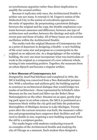 on synchronous opposites rather than direct duplication to amplify the curated artifact. Because it replicates only once, the Architectural Double is neither one nor many. It extends O. M. Ungers’s notion of the Dialectical City to the notion of coincidentia oppositorum— the unity of opposites. By perpetuating a persistent dialogue between the original and the copy, the Double emphasizes contrasts between sameness and difference, between one type of architecture and another, between the ideology and style of the recent past and those of today. All of these issues are in constant oscillation within the Architectural Double. The studio took the original Museum of Contemporary Art as a point of departure in designing a Double—a new building of the exact same size and program as a counterpoint to the original on an adjacent site. As a doppelgänger of the existing building, the new one must incorporate what was inarticulate or weak in the original as a component of a new coherent whole, turning it into something positive. Together, the museums form an urban diptych and become a singular artifact.