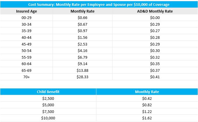Spouse: $10,000 to $500,000 in $10,000 increments with Guarantee Issue = $10,000