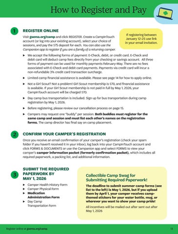 * Girl Scouts with 2025-26 memberships (purchased by December 31, 2025) or who attended GSEMA summer camp in 2025 are eligible to register for camp on January 12. Caregivers will receive an email invitation at 9 AM on January 12.