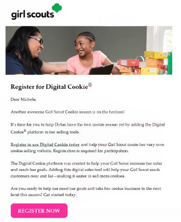 Look for the Digital Cookie registration email in your inbox on or after __________________ to register. If you can’t find it, contact your council or visit digitalcookie. girlscouts.org and click the “Need help” link.