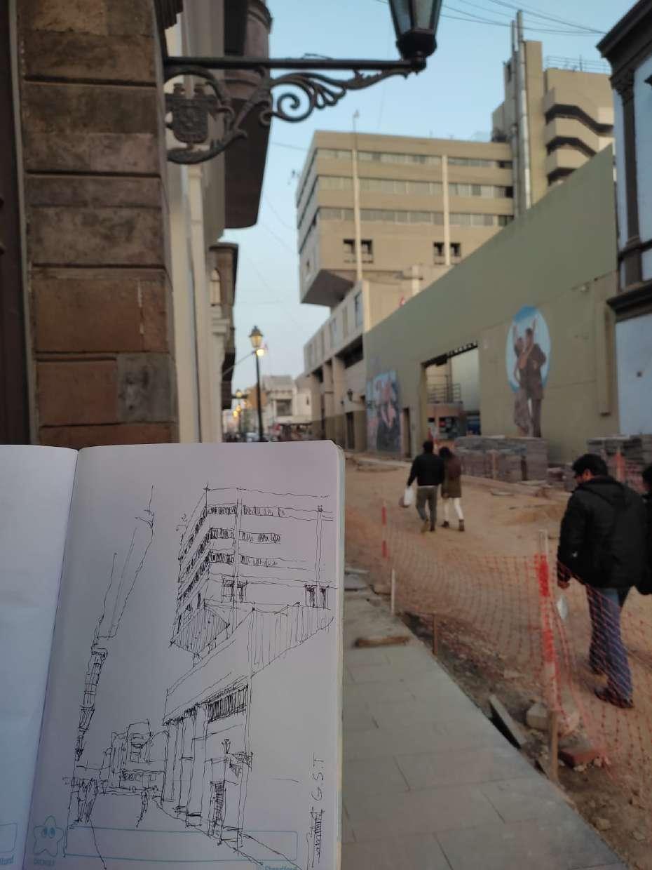 La simplificación, el volver esquema la realidad (sin volverla esquemática) implica mayor contraste lumínico. Al que apelo, por sugerencia de Víctor Beltrán, es a teñir de negro los cristales de los edificios (que advierte que el apunte se ha hecho de día, y se muestra de día). Sin embargo, el manejo de la luz (y por consiguiente de las sombras) es un arte con el poco me he involucrado hasta el momento. Es una tarea pendiente.