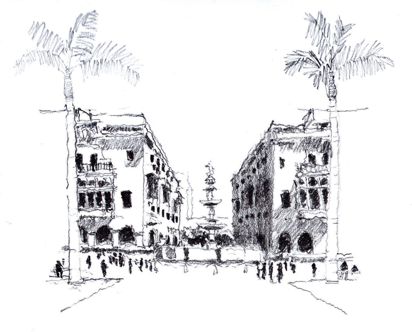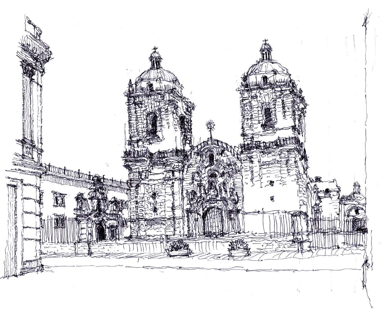 A veces podemos trazar enfáticamente la línea de horizonte; otras, podemos sugerirla con los árboles, la gente, la situación. Se trata de eso, dibujar no es hacer una disección, sino ver y estudiar la vida. Y la arquitectura no es sino vida [extrapolo aquí una idea que le escuché a Manuel Cuadra].