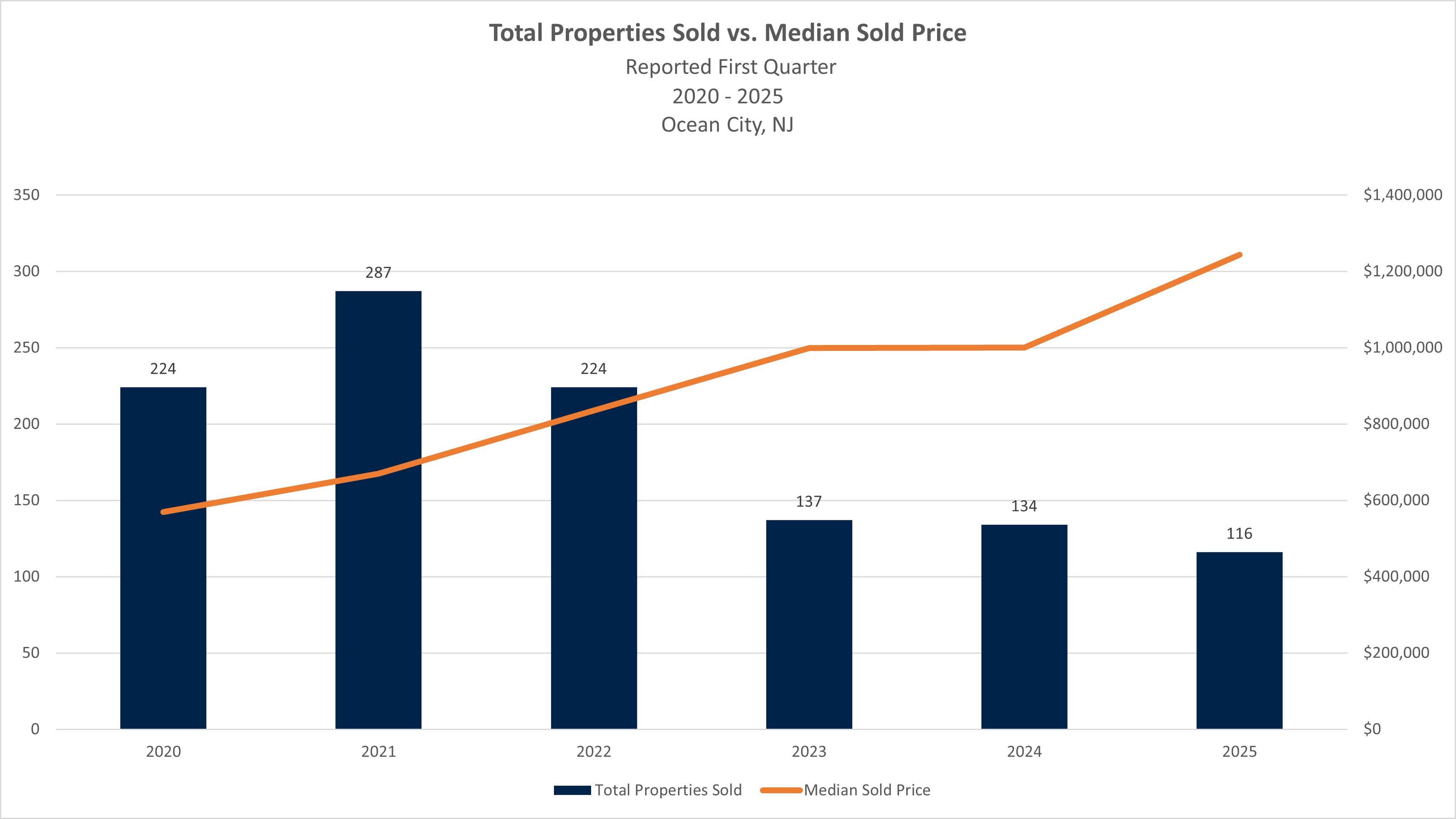For the first quarter of 2025,fewer properties sold in Ocean City,NJ compared to the first quarter of 2024.A total of 116 properties sold between January 1st and March 31st.These included all residential single-family homes,condominiums,multi-family dwellings,commercial and vacant land property.The reported 2025 first quarter properties sold were 13.4% fewer than same period last year when 134 properties sold.