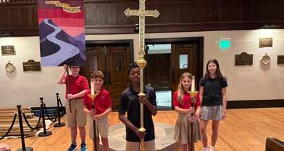 Seventh Graders Finnegan Coleman, Franklin Barton, Joseph Gettys, Elliot Bagwell, and Mimi Beasley practice the procession to serve as acolytes at the first All-School Chapel in the church.