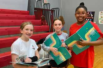 Sixth Graders Ruthie Vezina, Madison McCarty, and Olivia Bennett check out the new 2025 Banner yearbooks on Homecoming Day.
