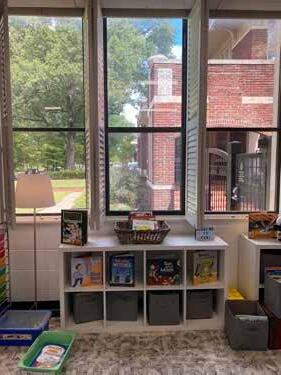 May Adrian, Bennett Lemelin, and Cooper Mitchell enjoy the library corner in First Grade Teacher Abby Hensley’s new classroom.