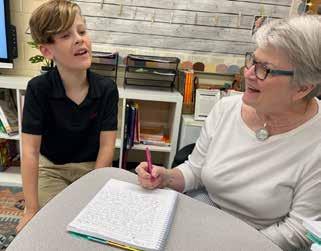 Fourth Grader Liam Mutchler and Teacher Jane Williams talk about a writing assignment during language arts.