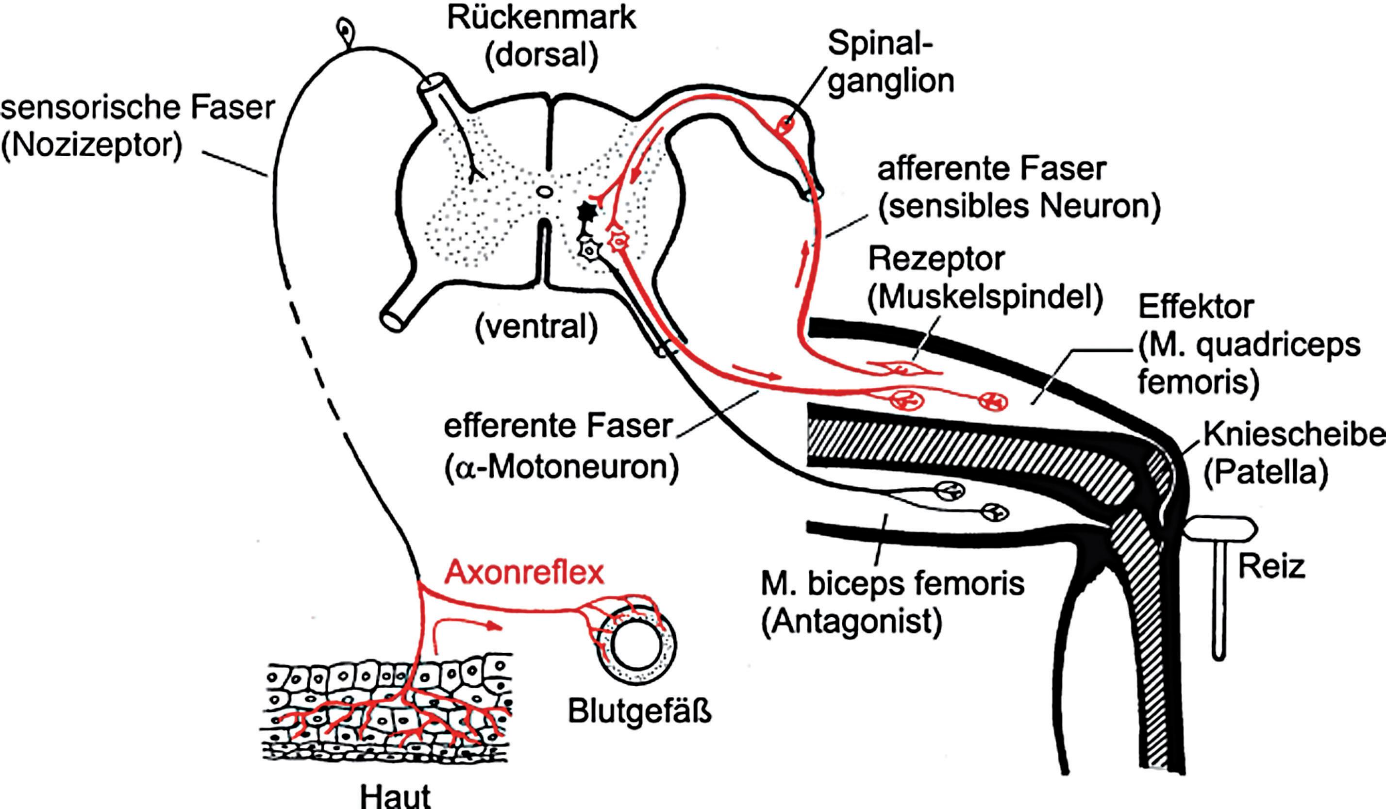 Die rechte hälfte der Abbildung zeigt eine neuronale Verbindung zwischen afferenten Fasern zum Rückenmark, in dem eine direkte Umschaltung zu den efferenten Fasern erfolgt. Spannungsveränderungen in den Muskel- und Sehnenspindeln geben ein Signal, das unverzüglich zu einer musklären Kontraktion führt. Um haltungen zu stabilisieren und bewegungen zu steuern, kontrahieren Agonist und Antagonist. Die beiden gegenläufigen Muskeln bewegen das Gelenk auf feinabgestimmte Weise. Ein Schlag auf die Patellasehne erzeugt einen kritischen Reiz, der zu einer spontanen Kontraktion des vorderen Oberschenkelmuskels führt. Jeder kennt diesen Kniesehnen-Reflex, der wichtig ist für haltung und balance. Nur so ist es möglich, dass wir gehen können, ohne über jeden Schritt separat nachdenken zu müssen.