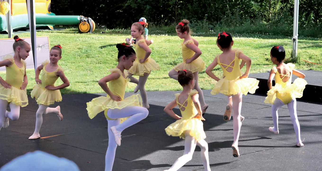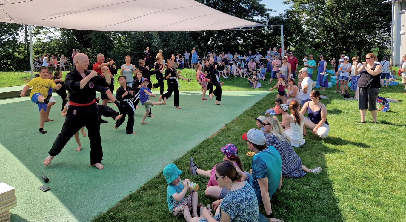 Sportfreunde tolle Vorführungen – mit Kampfkunst für Kinder, Ballett und Yoga zum Mitmachen. Ein besonders lustiger Teil war Low-T-Ball, ein Spiel, bei dem ein weicher Ball mit einem Schläger unter einem Holznetz hindurch geschlagen wird. Livia fand das so spannend, dass sie gleich mitspielte!