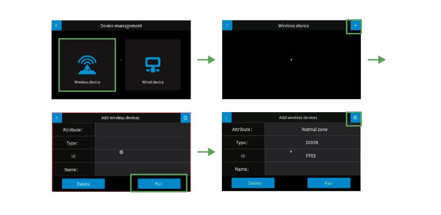 ÅbnAPP'en, gå ind på alarmens siden, vælg [Tilbehør] ->Tryk på “+”i øverste højre hjørne. Panelet er nu i indkodnings tilstand. -> Udløs enheden der skal tilføjes, såsom vindues- / dør sensor, PIR-detektor og fjernbetjening. Kun et tilbehør kan tilføjes ad gangen. Når tilføjelsen er vellykket, åbnesAPP-siden et vindue for at minde om det, og panel vil afslutte kode parrings tilstanden.