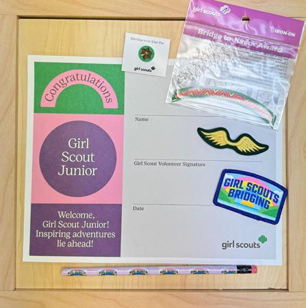 Kits are $8-$10 and include a Girl Scout bridging certificate, bridging arc patch, Girl Scout membership star pin and disc, bridging pencil, bridging fun patch, and brownie wings (only for bridge to Junior) in a clear plastic bag.