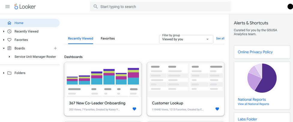 Looker is an online tool that service unit volunteers can use to access real-time membership data for their service unit. Select service unit volunteers can log in at any time to view data on all current Girl Scout members in their area. New memberships and updates to current membership data sync overnight and will appear in Looker the following day. Looker can be used from any computer or electronic device with internet capability and can provide the following information for all registered service unit Girl Scouts and volunteers:
