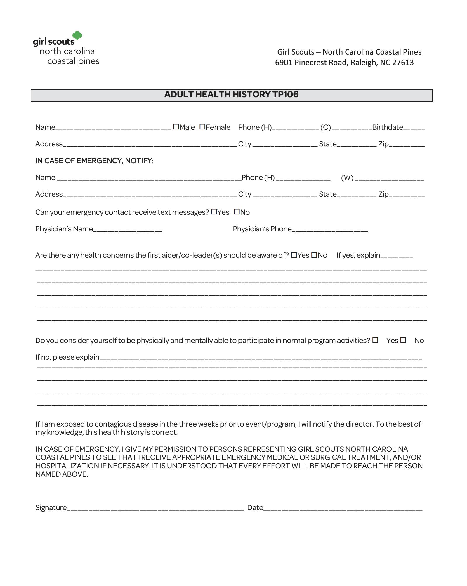 Authorization for Treatment: I hereby give permission to the medical personnel selected by the Girl Scout adult in charge to order X-rays, routine tests, and treatment, to release any records necessary for insurance purposes, and to provide or arrange necessary related transportation for my child. In the event I cannot be reached in an emergency, I hereby give permission to the physician selected by the Girl Scout adult in charge to secure and administer treatment, including hospitalization, for the person named above. This completed form may be photocopied for use off-site.