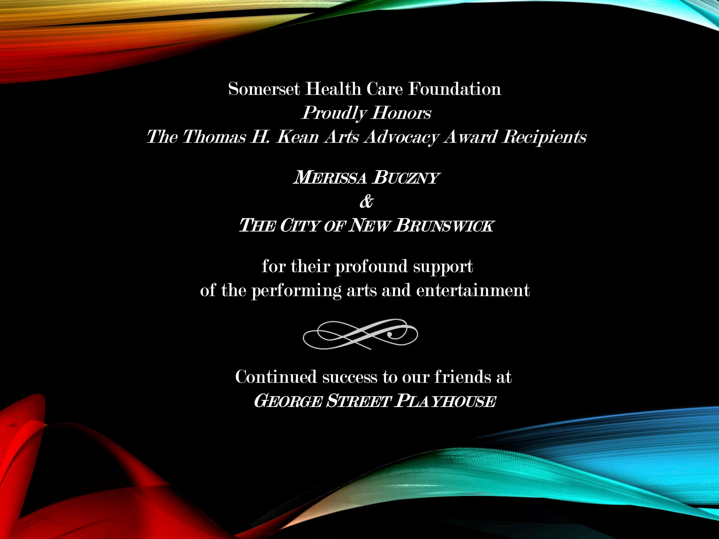Tonight, it is our honor to present the Thomas H. Kean Arts Advocacy Award to two extraordinary recipients whose dedication to the arts in our community has been nothing short of inspiring. We celebrate Merissa Buczny, the Executive Director of NBPAC and Vice President of DEVCO, whose tireless efforts have enriched our cultural landscape with a beautiful new venue for the arts. We also applaud The City of New Brunswick, represented by Mayor Jim Cahill and the City Council, for their unwavering commitment to fostering a vibrant arts scene that uplifts and empowers our entire community.