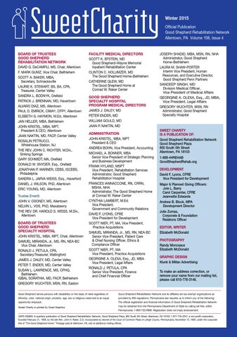 SWEET CHARITY IS A PUBLICATION OF: Good Shepherd Rehabilitation Network Good Shepherd Plaza 850 South 5th Street Allentown, PA 18103 1-888-44REHAB GoodShepherdRehab.org DEVELOPMENT David F. Lyons, CFRE Vice President for Development Major & Planned Giving Officers: Joie L. Barry Carol Carpenter, CFRE Jeannette Edwards Andrew B. Block, MPA Development Director Julie Zumas, Corporate & Foundation Relations Officer EDITOR, WRITER Elizabeth McDonald PHOTOGRAPHY Randy Monceaux Elizabeth McDonald GRAPHIC DESIGN Klunk & Millan Advertising To make an address correction, or remove your name from our mailing list, please call 610-776-3146.
