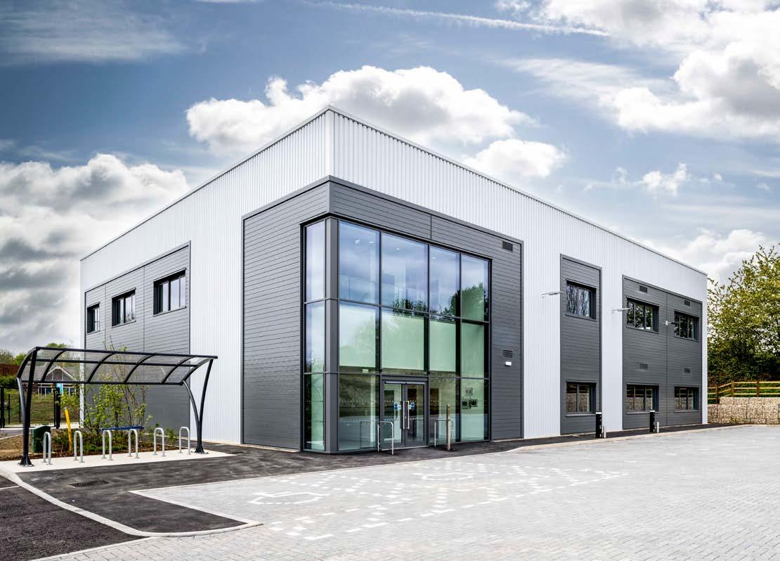 The 1100 m2 industrial unit is the first plot to be developed as part of our site-wide masterplan, and includes a warehouse, two-storey office, parking, and a service yard. The clever use of windows, curtain walling and contrasting cladding break up the prominent elevations to help reduce the visual impact of the building on the surrounding site, creating active frontages.