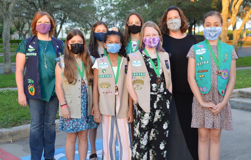 Troop #142142 finally had the opportunity to be awarded their Bronze Award (due to Covid). Sparky (SPURS/STARS SIGs and resident camp Equestrian Aide) recently recreated this photo - riding her first Girl Scout horse. Sparky rode Baby Girl at Camp Pryor in May 2017 as part of the STARS’ program, Saddlehorns session. Baby Girl is still a favorite choice to ride four years later (May 2021). She lives at the Misty Meadows Ranch barn with the 38 others horses in our Girl Scout herd.
