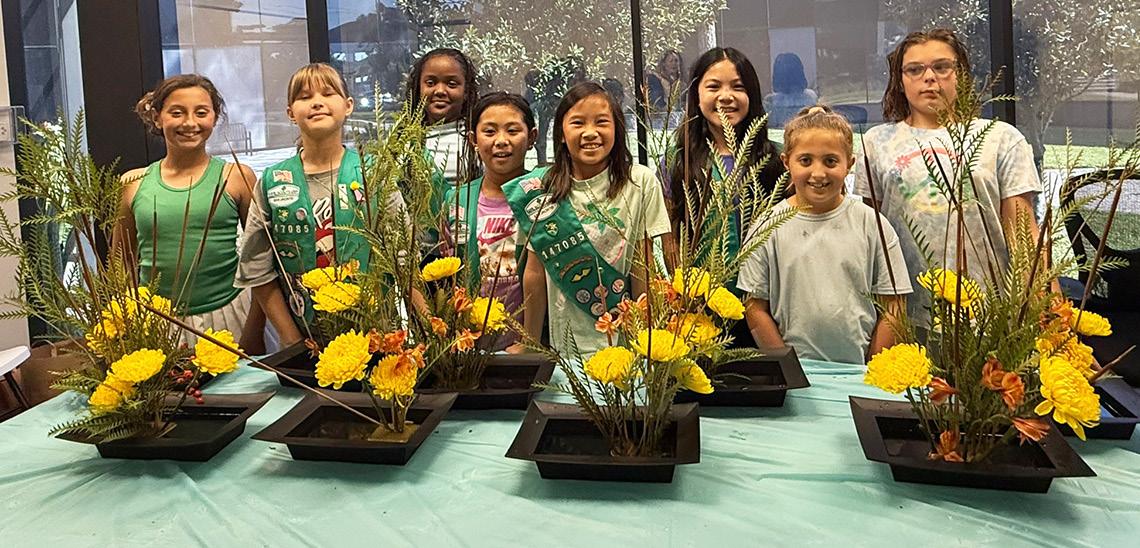 Troop 147085 conquered the art of flower arranging – Ikebana – with the help of the nonprofit organization Ikebana International. The girls learned about the symbolic lines of Ikebana: Shin (Heaven), Soe (Humanity), and Tai (Earth), which together form a beautiful triangular structure representing balance and harmony. Each Junior earned her Flower badge and received her very own Ikebana tools to continue practicing this graceful art at home. What a blooming success!
