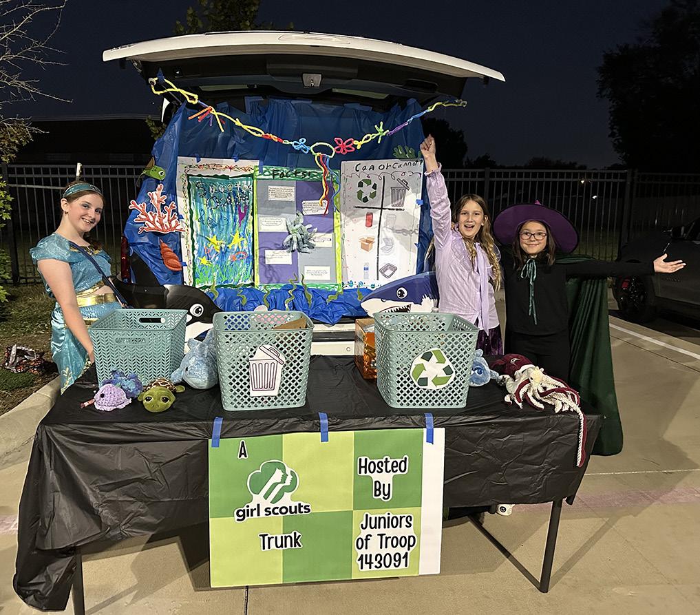Troop 143091 participated in a school trunk or treat to discuss recycling and how to and encourage attendees to help keep oceans clean and free of plastic and trash. This was to complete their Take Action for the aMUSE Journey.