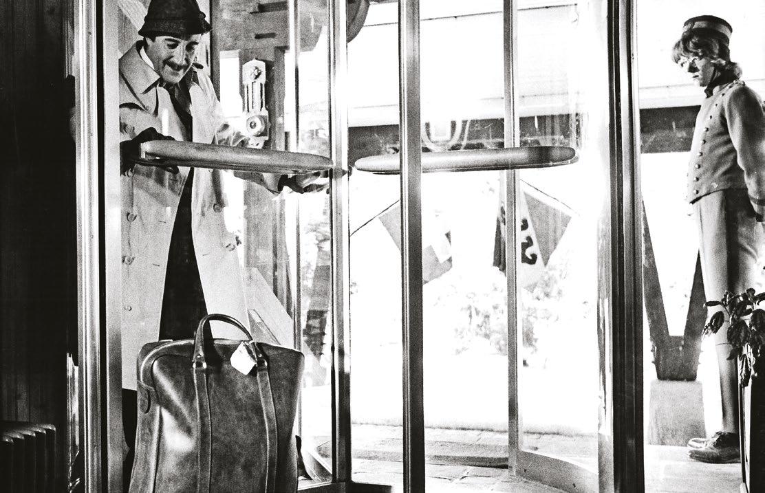 Sellers, heavily burdened with props, would stumble again and again through the revolving door before being rescued by a bellboy, to whom he had deadpan: “Tell me, how long have you been a bellboy?” One-night, mysterious pink footprints appeared across the village. Rumours spread quickly, especially after word got out that a diamond on display at the Palace had been “stolen.” The village policeman, Chlaus Küng, investigated alongside Clouseau himself, until the truth emerged: it was all part of the act, a story within the story, designed to amuse the locals.