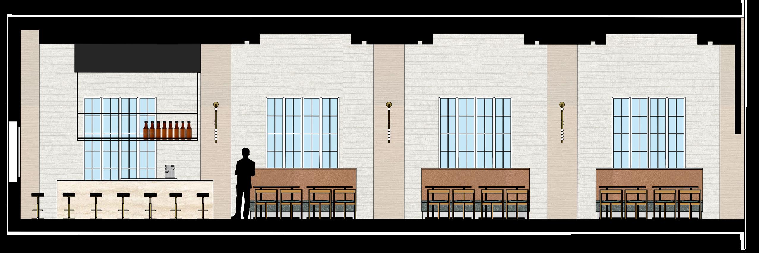 The client's goal includes desiging the dining hall to encourage their employees to work in the office by creating a space that emulates a food hall which provides various dinng options. The programmatic requirements includes selecting finishes which would be derived from the existing green marble flooring, the dining stations which will be developed include: Cafe Lounge, Entree, Order Pick-up, Grill, Deli, Italian, and Servery. My role was to source premium finishes (e.g. limestone slab, soapstone countertops/ alternatives, ordering custom samples for poured terrazzo flooring), meet with vendors to inquire about product capabilites, select a kitchen door design, and create elevations for the designated eatery spaces.
