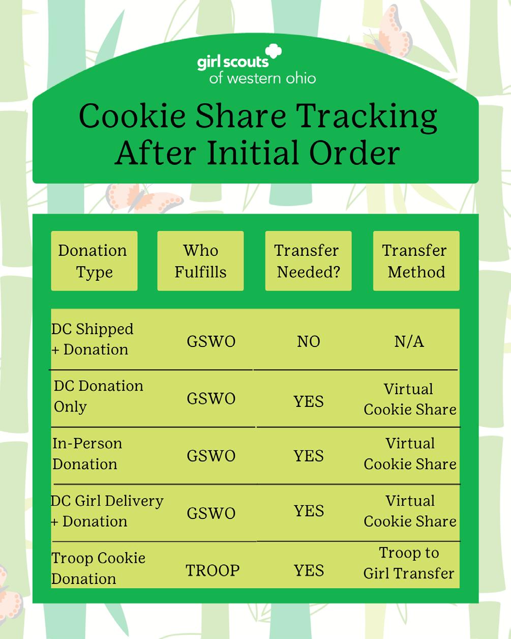 • The council manages the inventory and delivery of Virtual Cookie Share cookies. Troops will not need to do anything with packages other than accept the payment and track the donation in Smart Cookies under the Virtual Cookie Share column (pages 20 & 21).