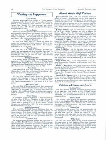 Weddings and Engagements Adair-Brooks Enlisting widespread social interest in October was the announcement by Mr. and Mrs. Perry Adair of the betrothal of their daughter, Miss Madeline Clair Adair, to James Eeon Brooks, Jr., their marriage was quietly solemnized later. Mr. Brooks, All-Southeastern guard, was graduated in 1939. Cowan-Henley Attracting sincere interest is the announcement of the engagement of Miss Mamye Sue Cowan, daughter of Mr. and Mrs. Otis A. Cowan of Marietta, to Carter Tate Henley of Smyrna. The marriage will take place a t an early date. Mr. Henley was in the class of 1940. DuBose-Solomon Mr. and Mrs. Isaac Boyd B. DuBose of Macon announce the engagement of their daughter, Betty, to Mr. English Solomon of Macon and Atlanta. Mr. Solomon graduated in M. E., in 1938. Dunn-Gunther Mr. and Mrs. E. S. Dunn of Sylacauga, Alabama, announce the engagement of their daughter, Vera Lee, to Donald Harrison Gunther of Poughkeepsie, N . Y., and Cumberland, Md., of the class of 1940. The wedding date is to be announced later. Fillingame-Hardee Mrs. Mabel Jeanne Fillingame has announced the engagement of her daughter, Rebecca, to Walter Daniel Hardee of St. Augustine, Fla. The marriage took place November 2 at the Peachtree Christian Church in Atlanta. Mr. Hardee was a member of the class of 1938. Ford-Berry The marriage of Miss Sara EUender Ford and Ralph Marion Berry took place on October 19 in Atlanta. Mr. Berry was a member of the class of 1939. Howell-Cambell Mr. and Mrs. Samuel Hoyle Howell of Atlanta announced the marriage of their daughter, Miss. Eillian Wyche Howell to John P. Cambell on October 19, 1940. Mr. Cambell was graduated in 1930 with a B. S. in Commerce. MacDonell-Gibbs Mr. and Mrs. William James Reddy have announced the marriage of their grand-daughter, Miss Rose Eucile MacDonell of Savannah, Ga., to Robert Mack Gibbs of Atlanta. The wedding took place on Sunday, September 1, 1940, in Savannah. Mr. Gibbs received a B. S. in M . E. in 1939. Meyer-Strauss A prominent event of September 22 was the maniage of Miss Olive E. Meyer, daughter of Mrs. Mayme E. Meyer and the late Harry L. Meyer of Miami, Fla., to Ensign Ben A. Strauss, U. S. N. R. of Atlanta. Ensign Strauss was graduated in 1935. He is now attached to the Submarine U. S. S. R-6. Rathbone-de Golian Mr. and Mrs. Wofford Robert Rathbone have announced the engagement and approaching marriage of their daughter, Miss Helen Dufour Rathbone of Austin, Texas, to Felix de Golian, Jr. of Atlanta. Mr. de Golian was in the class of 1934 and later graduated from the U. S. Naval Academy. Shadburn-Holz An announcement of cordial interest was that made by Mr. and Mrs. Daniel Webster Shadburn of the marriage of their daughter, Miss Dana Shadburn, to Forrest Henry Holz, which was solemnized September 28, 1940 a t the home of the bride's parents. Mr. Holz, Editor of the 1940 Yellow Jacket, was graduated in June.