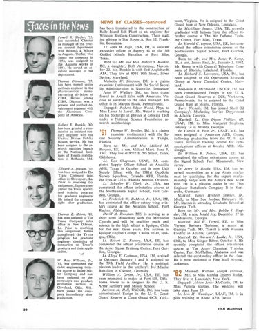 NEWS BY CLASSES-confinued has been transferred to the construction of Belle Island Salt Plant as an engineer for Winston Brothers Construction. Their mailing address is Star Route A, Box 12, Franklin, Louisiana. Lt. John H. Page, USA, IM, is assistant executive officer of Battery G of the 5th Guided .Missile Battalion at Fort Bliss, Texas. Born to: Mr. and Mrs. Robert S. Runkle, BC, a daughter, Beth Armstrong, November 22. Mr. Runkle is with Ted Anglehardt, AIA. They live at 8361 16th Street, Silver Spring, Maryland. Malcolm W. Simpson, IM, is a claims examiner (retirement) with the Social Security Administration in Nashville, Tennessee. Jesse W. Wallace, IM, has been transferred to Avecil Sales with American Viscose as assistant to the sales manager. His office is in Marcus Hook, Pennsylvania. Engaged: Robert Edgar Wood, Phys, to Miss Lorna Jo Jarrell. Mr. Wood is working on his doctorate in physics at Georgia Tech under a National Science Foundation research assistantship. ' C 1 Thomas W. Beasley, IM, is a claims UI examiner (retirement) with the Social Security Administration in Tampa, Florida. Born t o : Mr. and Mrs. Millard M. Burgess, EE, a son, Millard Mark, June 5, 1961. They live at 9772 E. 5th Street, Tulsa, Oklahoma. Lt. Don Chapman, USAF, IM, completed Supply Officer School at Amarillo AFB, Texas in October and is now Unit Supply Officer with the 1381st Geodetic Survey Squadron, Orlando AFB, Florida. He lives at 7 2 2 % Florida Avenue, Orlando. Lt. Schuyler W. Clark, Jr., USA, has completed the officer orientation course at the Southeastern Signal School, Fort Gordon, Georgia. Lt. Frederick W. DeMent, Jr., USA, IM, has completed the officer rotary wing aviators course at the Aviation School, Fort Rucker, Alabama. David A. Dunstan, M E , is serving as a short term Missionary with the Methodist Church and will be teaching math and science in the high school at Iquique, Chile for the next three years. His address is Iquique English College, Casilla 16-D, Iquique, Chile. Lt. Robert K. Feeney, USA, EE, has completed the officer orientation course at the Army Signal Training Center, Fort Gordon, Georgia. Lt. Lloyd E. Gottman, USA, IM, arrived in Germany January 1 and is assigned to the 79th Field Artillery. He is assistant platoon leader in the artillery's 3rd Missile Battalion in Giessen, Germany. William A. Green, Jr., USA, EE, has been promoted to major at Fort Sill, Oklahoma where he is assigned to the U. S. Army Artillery and Missile School. Jackson M. Hall, USCGR, IM, has been commissioned Ensign in the U. S. Coast Guard Reserve at Coast Guard OCS, York-