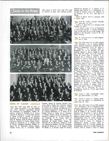 NEWS BY CLASSES - continued 'OO The 1923 class held its 40th refc*J union November 2 at the Capital City Club. Advance registration showed the following' in attendance: James W. Asbury, George P. Bartlett, B. L. Avera, Charles R. Beacham, J. Frank Bell, Homer P. Bond, Vernon L. Borum, A. Thomas Bradbury, G. H. Brodnax, D. W. Brosnan, Ellis W. Bullock, Jesse H. Burke, Oscar D. Calhoun, Charles S. Carter, Hugh Carter, Joseph M. Chambliss, A. L. Chason, John O. Chiles, Hampton Daughtry, Wilmer C. Davis, W. E. Dimmock, George Echols, Charles Fram, Jay L. Frankum, Glenn