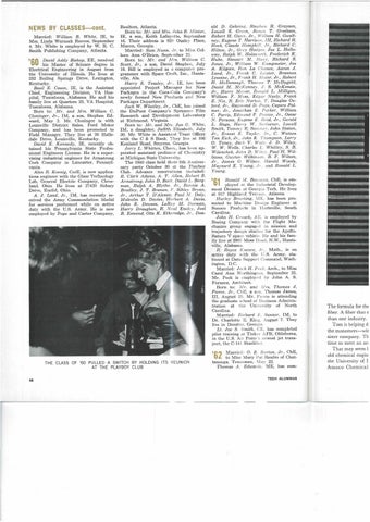 Realtors, Atlanta. Born to: Mr. and Mrs. John R. Minter, IE, a son, Keith Lafayette, September 16. Their address is 929 Ousley Place, Macon, Georgia. Married: Sam Nunn, Jr. to Miss Colleen Ann O'Brien, September 25. Born to: Mr. and Mrs. William C. Scott, Jr., a son, David Stephen, July 16. Bill is employed as a computer programmer with Space Craft, Inc., Huntsville, Ala. Harry E. Teasley, Jr., IE, has been appointed Project Manager for New Packages in the Coca-Cola Company's newly formed New Products and New Packages Department. Jack W. Whatley, Jr., ChE, has joined the DuPont Company's Spruance Film Research and Development Laboratory at Richmond, Virginia. Born to: Mr. and Mrs. Jon G. White, IM, a daughter, Judith Elizabeth, July 30. Mr. White is Assistant Trust Officer with the C & S Bank. They live at 106 Kenland Road, Smyrna, Georgia. Jerry L. Whitten, Chem., has been appointed assistant professor of Chemistry at Michigan State University. The 1960 class held their 5th Anniversary party October 30 at the Playboy Club. Advance reservations included: R. Clark Adams, A. T. Allen, Robert S. Armstrong, John D. Beck. David L. Bergman, Ralph A. Blythe, Jr., Ronnie A. Bradley, J. T. Branan, F. Sibley Bryan, Jr., Arthur T. D'Alessio. Paul M. Daly, Malcolm D. Davies, Herbert A. Davis, John E. Dewees, LeRoy M. Dorman, Harry Draughon, R. Neal Ensley, Joel B. Esmond, Otis K. Etheredge, Jr., Don-