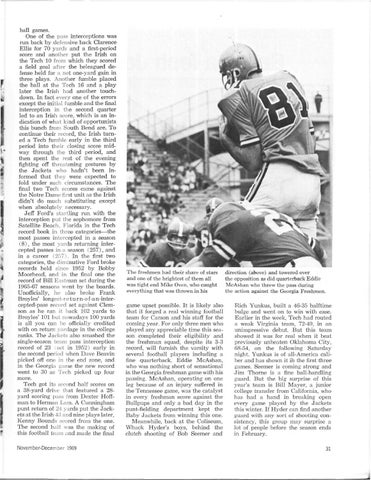 ball games. One of the pass interceptions was run back by defensive back Clarence Ellis for 70 y a r d s a n d a first-period score a n d another p u t the Irish on the Tech 10 from which they scored a field goal after the beleagued defense held for a net one-yard gain in three plays. Another fumble placed the ball a t the Tech 16 a n d a play later the Irish h a d another touchdown. I n fact every one of t h e errors except the initial fumble a n d t h e final interception in the second quarter led to an Irish score, which is a n indication of what kind of opportunists this bunch from South Bend are. T o continue their record, the Irish turned a T e c h fumble early in the third period into their closing score midway through the third period, a n d then spent the rest of the evening fighting off threatening gestures b y the J a c k e t s who h a d n ' t been informed t h a t they were expected to fold under such circumstances. T h e final two Tech scores came against the N o t r e D a m e first unit as t h e Irish didn't do much substituting except when absolutely necessary. Jeff Ford's startling r u n with the interception p u t the sophomore from Satellite Beach, Florida in the Tech record book in three categories—the most passes intercepted in a season ( 8 ) , the most yards returning intercepted passes in a season (257), a n d in a career (257). I n the first two categories, the diminutive Ford broke records held since 1952 by Bobby Moorhead, and in the final one the record of Bill E a s t m a n set during the 1965-67 seasons went by the boards. Unofficially, he also broke F r a n k Broyles' longest-re t u r n - o f - a n - i n t e r cepted-pass record set against Clemson as h e ran it back 102 yards to Broyles' 101 but nowadays 100 yards is all you can be officially credited with on return yardage in the college ranks. T h e Jackets also smashed t h e single-season team pass interception record of 23 (set in 1952) early in the second period when Dave Beavin picked off one in the end zone, and in the Georgia game the new record went to 30 as Tech picked u p four more. T e c h got its second half scores on a 38-yard drive that featured a 28y a r d scoring pass from Dexter Hoffm a n to H e r m a n Lam. A Cunningham p u n t return of 24 yards put the Jackets at the Irish 43 and nine plays later, K e n n y Bounds scored from the one. T h e second half was the making of this football team a n d m a d e the final November-December 1969