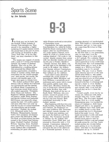 9-3 J- he Pack may not be back, but the football Yellow Jackets of Georgia Tech certainly are. They proved it by compiling a highly satisfying 8-3 regular-season record, the second best in the past 14 years, and earning an invitation to play Texas Tech Dec. 19 in the Sun Bowl (see story elsewhere in this issue). The season was capped, of course, with a solid 17-7 victory over Georgia between the hedges of Sanford Stadium. That win on Nov. 28, highlighted by a crackling defense that presented the offense with scoring opportunities, preceded a winter of content among Tech fans everywhere for the second straight year. And maybe, just maybe, the current cold months seem a bit longer once again in Athens town. The Jackets parlayed their quick defense with an offense that featured two quarterbacks and the running of tailback Brent Cunningham to beat everyone except three nationally-ranked opponents (Tennessee, Notre Dame and Auburn). The Engineers' defense, spearheaded by all-America tackle Rock Perdoni, end Smylie Gebhart and linebacker Bill Flowers, was especially stingy against the rush (111 yards a game) and more often than not came up with the big play in critical situations (25 interceptions and 24 fumble recoveries). Perdoni, the modest 5-11, 236-pound senior from Wellesley, Massachusetts, became Tech's first consensus all-America since center Jim Breland in 1966. The Rock, as of this writing, has been named to the United Press International, Football Coaches', Football Writers,' Sporting News, Football News and Walter Camp all-America teams. Gebhart did a consistently outstanding job game after game, 22