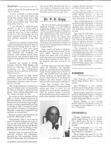 L 3 S t m 3 n (Continued from page 19) thinking about all the good people I'd met in Atlanta. "I knew 1 wanted to attend dental school, so we contacted Emory and found that officials there had a high opinion of Georgia Tech and would accept lower grades from Tech than from other schools. "I also thought it would be more pleasant to go to a school with a winning team," he said, "so that football would be more fun. It was a difficult decision to leave Mississippi, but I've never regretted choosing Tech and I have excellent memories of my time there." Eastman was a defensive back for the Jackets and played in the Gator Bowl in 1965 and the Orange Bowl in 1966. "I was fortunate to start every game beginning in my sophomore year," he said. Eastman was Academic AllAmerica, team captain several times, and was the only defensive back to be named National Back of the Week one year. Eastman was elected to ANAK, Koseme, Omicron Delta Kappa, and served as chairman of the Judicial Committee of the Interfraternity Council. He was a member of Phi Delta Theta fraternity. Eastman married his high school sweetheart, Sondra, during his junior year at Tech. They have an eight-yearold daughter, Shannon, and a six-yearold son, Gordon. "My fondest memories of Tech are of the good athletic years we had and the fact that my wife got to attend the bowl games. Tech's athletic department was very family-oriented," he said. As a senior at Tech, Eastman did not apply to Emory Dental School as he had once planned. "We decided we had been far away from home long enough," he said. So when I graduated from Tech in biology in 1968, I enrolled in dental school at the University of Tennessee at Memphis. I came back to Emory for my residency in orthodontics." Eastman opened a private practice in Starkville, Mississippi in 1973. "Orthodontics takes a lot of time in terms of outside reading and study to stay on top of my field," he said. "My family comes first, then my job. Besides spending time with my family, I enjoy hunting duck and quail and fishing." Eastman stays in touch with former fraternity brothers and teammates, especially his Tech roommate, Claude Shook of Mississippi. He contributes to 20 GEORGIA TECH ALUMNI MAGAZINE
