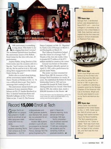 10th anniversary is something to sing about. Who better to do the singing than Jose Carreras? The acclaimed Spanish tenor headlines the anniversary season of the Robert Ferst Center for the Arts with a Jan. 25 performance. Andrea Hoffer, acting director of the Ferst Center, says the occasion calls for a big star. "Jose Carreras was like pie in the sky. But he said he'd do it. He's only doing three engagements in the United States during the year." Hoffer also is excited about kicking off the anniversary season with the Dance Theatre of Harlem on Oct. 12. "It was a difficult date to get. They had to rearrange their routing to do it." The anniversary season includes performances by jazz musician Diane Schuur on Oct. 27; Sandra Bernhard on Nov. 3; classical musicians Katia and Marielle Labeque on Dec. 5; Penn & Teller on Jan. 11 and 12; The Parsons