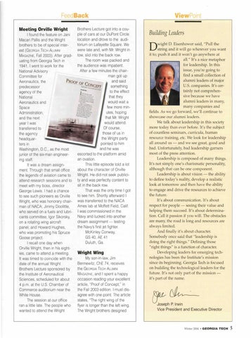 wight D. Eisenhower said, "Pull the string and it will go wherever you want it to; push it and it won't go anywhere at all." It's a nice metaphor for leadership. In this issue, you're going to find a small collection of alumni leaders of major U.S. companies. It's certainly not comprehensive because we have alumni leaders in many, many companies and fields. As we go forward, we'll continue to showcase our alumni leaders. We talk about leadership in this society more today than ever before. It's the subject of countless seminars, curricula, human resource training, etc. We look for leadership all around us — and we see great, good and bad. Unfortunately, bad leadership garners most of the press attention. Leadership is composed of many things. It's not simply one's charismatic personality, although that can be one component. Leadership is about vision — the ability to define today's reality, develop a realistic look at tomorrow and then have the ability to engage and drive the resources to achieve the future. It's about communication. It's about respect for people — seeing their value and helping them succeed. It's about determination. Call it passion if you will. The obstacles are many, the road is long and resources are always limited. And finally it's about character. Somebody once said that "leadership is doing the right things." Defining those "right things" is a function of character. Developing leaders for emerging technologies has been the Institute's mission since its beginning. Georgia Tech is focused on building the technological leaders for the future. It's not only part of the mission — it's part of the name.