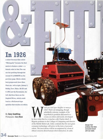ould you want your daughter to marry a robot? That's an intriguing, though admittedly extreme, example of the hypothetical questions discussed in a course on robots and society developed by Ron Arkin that he co-teaches with Charles Isbell. A Regents professor in the College of Computing and director of the Mobile Robot Lab, Arkin contends that the next great consumer technology will arrive in the form of personal robots. The innovations will be accompanied by a host of ethical concerns about human-robot interaction, he adds.