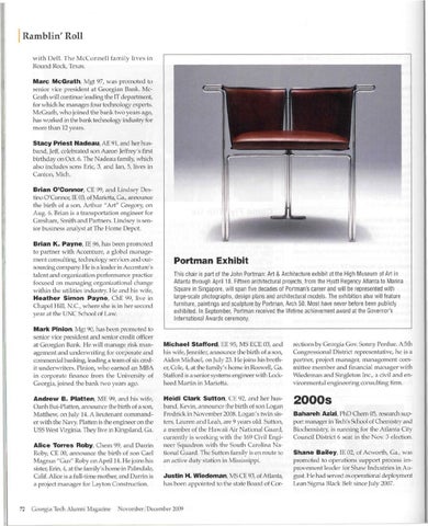 Ramblin' Roll w i t h Dell. The McConnell family lives in Round Rock, Texas. Marc McGrath, Mgt 97, was promoted to senior vice president at Georgian Bank. McGrath will continue leading the IT department, for which he manages four technology experts. McGrath, who joined the bank two years ago, has worked in the bank technology industry for more than 12 years. S t a c y Priest N a d e a u , AE 91, and her husband, Jeff, celebrated son Aaron Jeffrey's first birthday on Oct. 6. The Nadeau family, which also includes sons Eric, 3, and Ian, 5, lives in Canton, Mich. Brian O'Connor, CE 99, and Lindsey Destine O'Connor, IE 03, of Marietta, Ga., announce the birth of a son, Arthur "Art" Gregory, on Aug. 6. Brian is a transportation engineer for Gresham, Smith and Partners. Lindsey is senior business analyst at The Home Depot. Brian K. P a y n e , IE 96, has been promoted to partner with Accenture, a global management consulting, technology services and outsourcing company. He is a leader in Accenture's talent and organization performance practice focused on managing organizational change within the utilities industry. He and his wife, H e a t h e r S i m o n P a y n e , ChE 99, live in Chapel Hill, N.C., where she is in her second year at the UNC School of Law. Mark Pinion, Mgt 90, has been promoted to senior vice president and senior credit officer at Georgian Bank. He will manage risk management and underwriting for corporate and commercial banking, leading a team of six credit underwriters. Pinion, who earned an MBA in corporate finance from the University of Georgia, joined the bank two years ago. A n d r e w B. P l a t t e n , ME 99, and his wife, Oanh Bui-Platten, announce the birth of a son, Matthew, on July 14. A lieutenant commander with the Navy, Platten is the engineer on the USS West Virginia. They live in Kingsland, Ga. A l i c e Torres Roby, Chem 99, and Darrin Roby, CE 00, announce the birth of son Cael Magnus "Gus" Roby on April 14. He joins his sister, Erin, 4, at the family's home in Palmdale, Calif. Alice is a full-time mother, and Darrin is a project manager for Layton Construction.