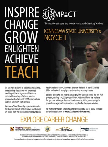 has created the l-IMPACT Noyce II program designed to recruit talented STEM professionals into physics and chemistry teaching careers. Selected applicants will receive annual $10,000 stipends during the five year program, totaling $50,000 per participant. Additional funds are available for graduate tuition, professional development activities, memberships in professional organizations, travel, and supplies for classroom activities. For more information, email iimpact@kennesaw.edu, and to apply, complete the online application at www.GANoyceScholars.org.