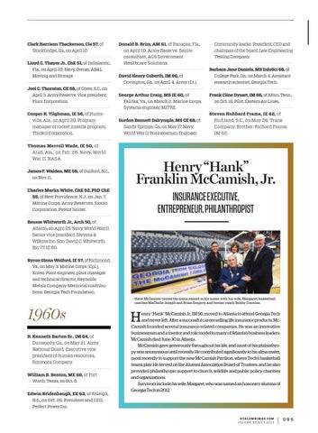 enry “Hank” McCamish Jr., IM 50, moved to Atlanta to attend Georgia Tech and never left. After a successful career selling life insurance products, McCamish founded several insurance-related companies. He was an innovative businessman and a mentor and role model to many of Atlanta’s business leaders. McCamish died June 30 in Atlanta. McCamish gave generously throughout his life, and most of his philanthropy was anonymous until recently. He contributed significantly to his alma mater, most recently to support the new McCamish Pavilion, where Tech’s basketball teams play. He served on the Alumni Association Board of Trustees, and he also provided philanthropic support to church, wildlife and public policy charities and organizations. Survivors include his wife, Margaret, who was named an honorary alumna of Georgia Tech in 2012.