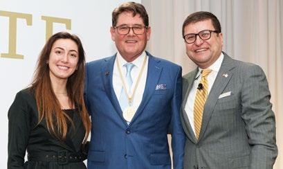 Serial entrepreneur Tom Noonan, ME 83 (center), with student ambassador Katherine Dickenson, CS 25, and Magd Riad, IE 01, at the Gold & White Honors Gala in 2023.