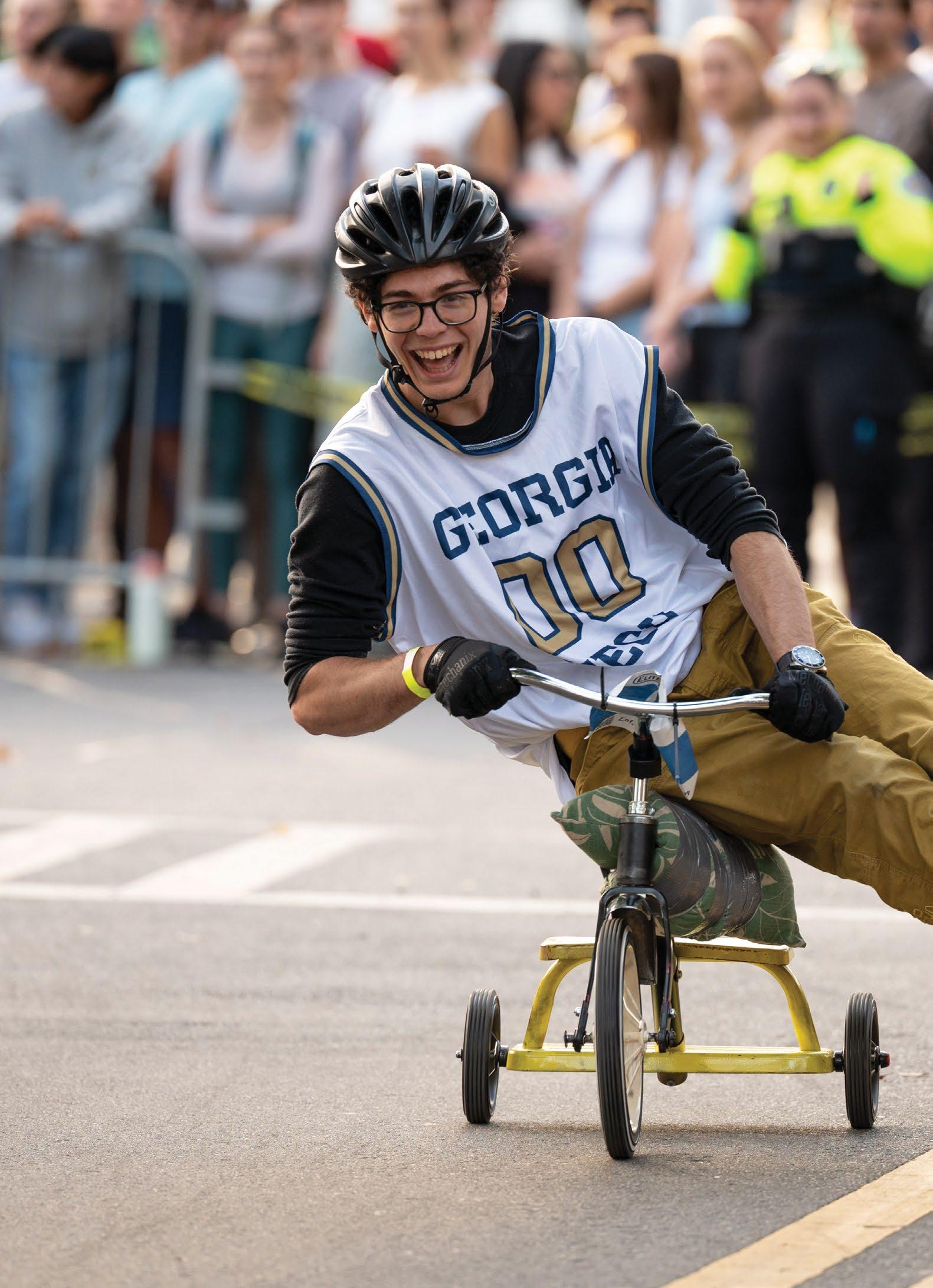 The Mini 500 tricycle race is held each year during Homecoming. Teams (four racers and three pit crew members responsible for tire rotations) must complete 8 laps around Peters Parking Deck. This year, Phi Kappa Theta captured first place.