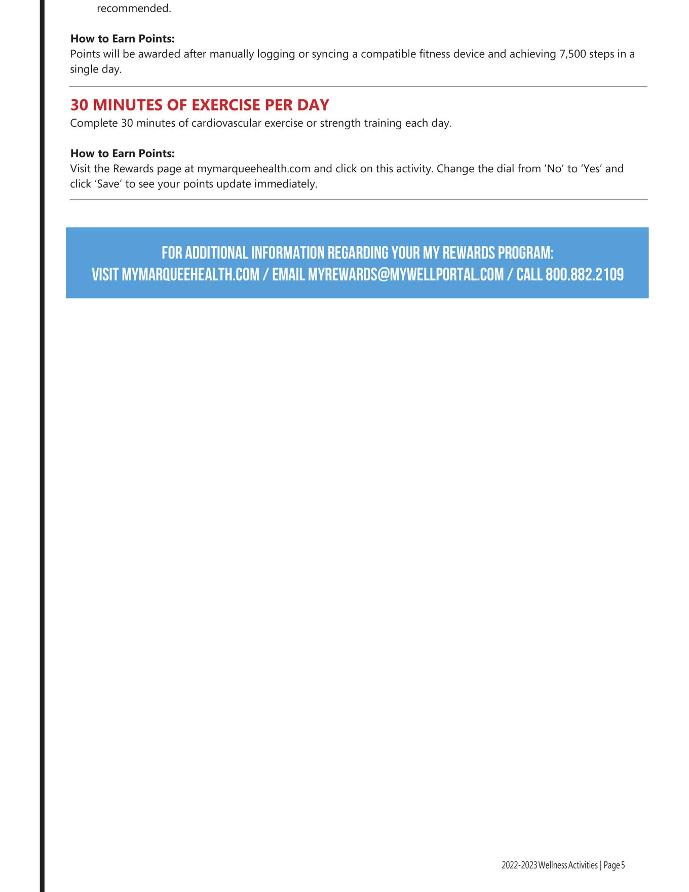 Want in? The current quarter is underway and runs through the end of the year Points are earned most commonly from annual physicals, daily steps, and wellness challenges, but there are tons of other ways to earn as well Check out the Rewards tab at mymarqueehealth com or the attached My Rewards Activity Guide for more details.