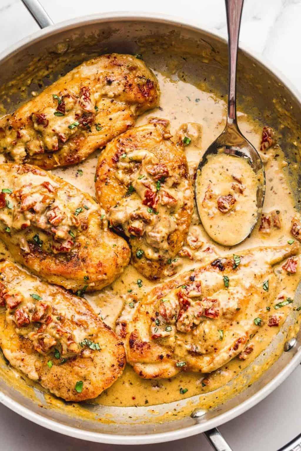 Season with salt and pepper to your taste, add the sundried tomatoes then put the chicken back in the sauce and let the sauce simmer and thicken for a few more minutes.