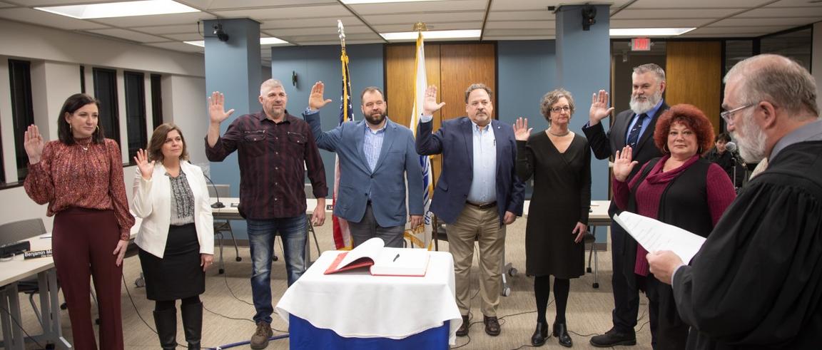 Welcome back the returning Commissioners and the new sworn in Commissioners! A new board of 9 Grand Traverse County Commissioners, including 5 newly elected Commissioners, took their oath of office from the Honorable Judge Kevin Elsenheimer of the 13th Circuit Court on 1/3/23. After the 2020 Census, the Grand Traverse County Board went from 7 to 9 Commissioners. Family and friends joined the swearing-in ceremony for a standing-room-only event. The new Commission had its first official meeting Wednesday 1/4/23. Featured left to right is Commissioner Lauren Flynn, Commissioner Ashlea Walter, Commissioner Brad Jewett, Commissioner Rob Hentschel, Commissioner Darryl Nelson, Commissioner TJ Andrews, Commissioner Scott Sieffert, and Commissioner Penny Morris. Commissioner Brian McAllister had a scheduling conflict and was sworn in earlier today by Clerk Bonnie Scheele. *Future Board of Commissioner meetings will now be held at 9:00 am.