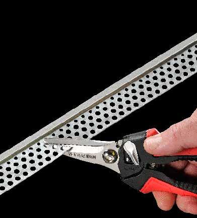OPTIMISED GEOMETRY TO CUT PAPER AND CARD, KEVLAR, CARBON AND GLASS CLOTH, FABRIC, LEATHER, CARPET, LINOLEUM, WIRE, CABLE, THIN SHEET METALS, RUBBER, STRAPPING, SARKING, LIGHTWEIGHT MESH, PLASTIC SHEET, FLASHING AND OTHER TOUGH MATERIALS. AMBIDEXTROUS WITH DUAL SIDED, QUICK RELEASE THUMB LOCK. DURABLE SOFT GRIP CHEMICAL RESISTANT HANDLES. THESE SNIPS DO IT ALL!