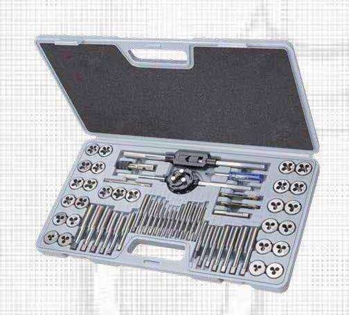 60 Piece Metric / Imperial Tungsten Steel Tap & Die Set Set Includes: T-Handle Tap Wrench, Long Handle Tap Wrench, Long Handle Die Wrench, Metric Screw Pitch Gauge, Imperial Screw Pitch Gauge
