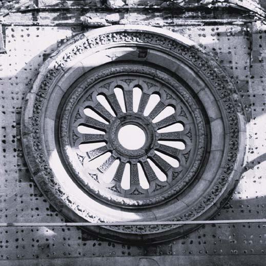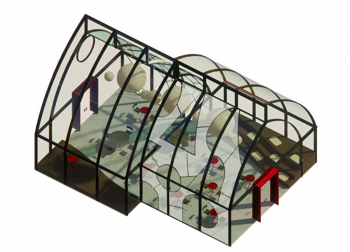South facing glass wall features a precise circular opening that allows user to frame Historic elements. When standing at a specific point inside of the Frame, the user gets a precisely framed.